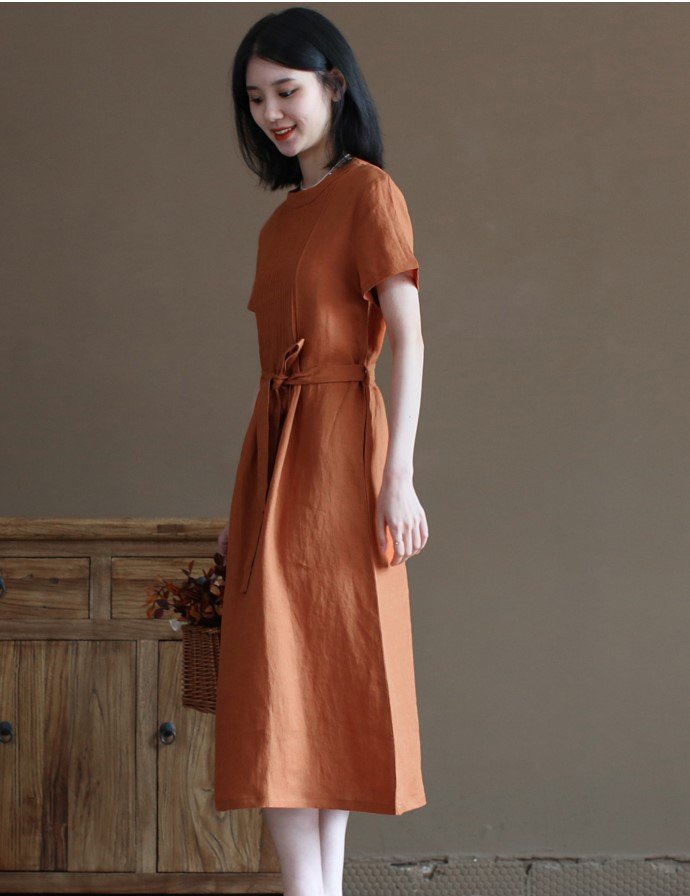 ✨Đầm suông linen nữ cổ tròn kín đáo, đầm có túi chéo tiện lợi, kèm dây thắt eo xinh NH191 cam