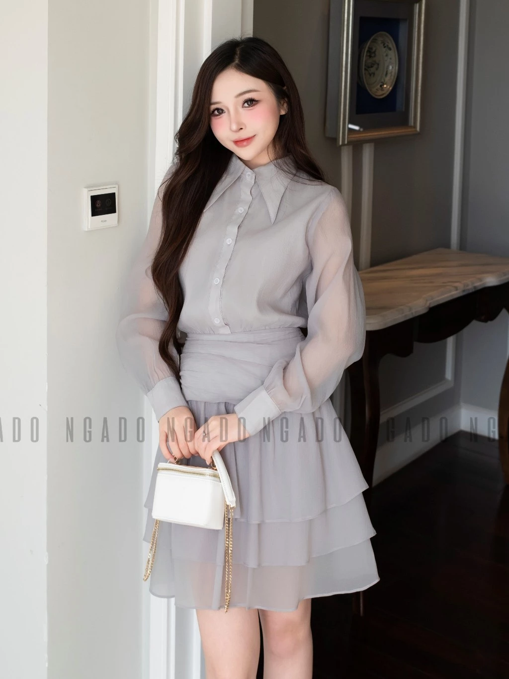✨Đầm xám phối voan NGADO , đầm sơ mi , đầm dài tay