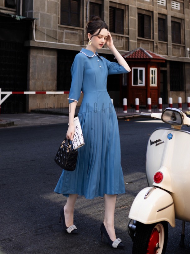 Mã DP217 | Váy Xanh Phối Cúc Xếp Ly Siêu ĐẸP | Váy Đầm Trung Niên | gọi ngay DT ZALO 0345.735.475