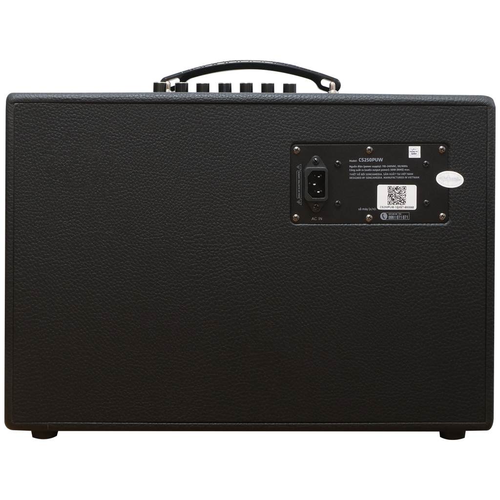 Dàn âm thanh di động xách tay CS250PUW - Loa karaoke di động xách tay CS250PUW TÍNH NĂNG NỔI BẬT - Nhỏ gọn xách tay - Tích hợp vang số chỉnh cơ - Chức năng boost bass dành riêng cho nhạc sàn sôi động THÔNG SỐ KỸ THUẬT - Màu sắc : Màu đen - Màu lưới : Lưới Xám (logo KBEATBOX) - Loại thùng : Thùng gỗ bọc da - quai xách - Bluetooth 5.0 - Nguồn cấp : 110~240VAC, 50/60Hz (auto volt) - Pin : Pin sạc Li-ion 15V-2200mAh (33Wh) - Hệ thống loa : BASS 25CM (10") + TREBLE - Công suất RMS : 50W (max) - Công suất PMPO : 300W (max) - Ngõ kết nối : MP3 USB, LINE IN (jack 3.5 mm) - Cân nặng : 8 Kg - Kích thước thùng carton (RxCxS) : 480 x 400 x 265 mm