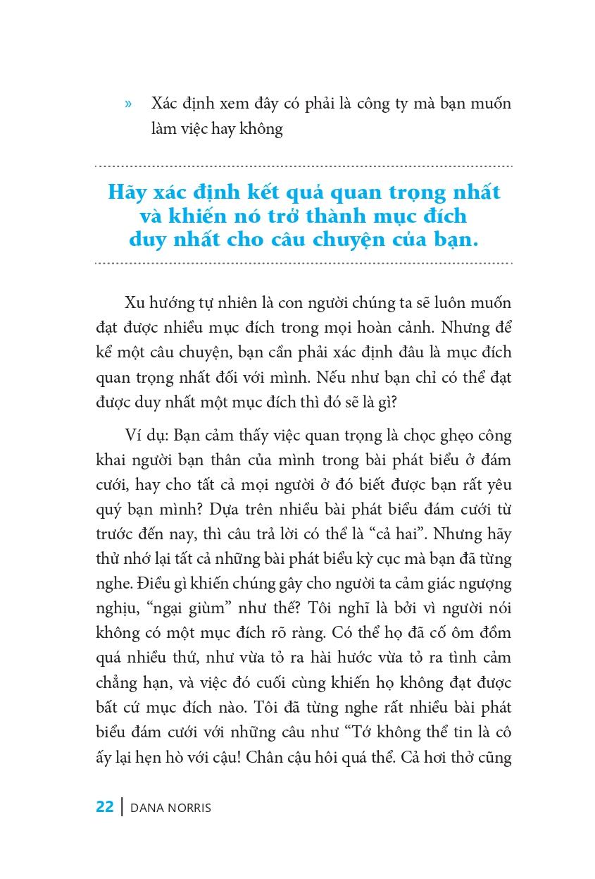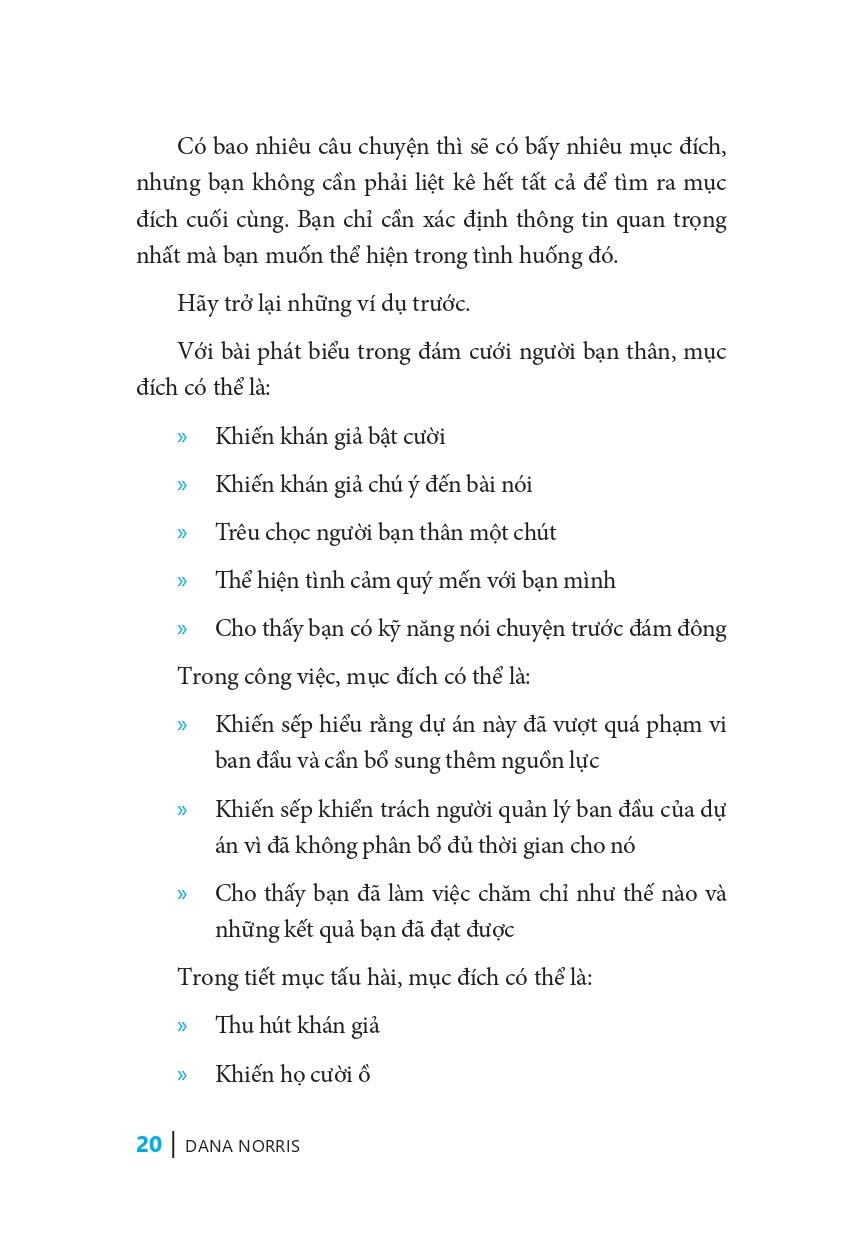 Tác giả Dana Norris viết lại một cách giản dị và nhiều gợi ý dễ hiểu để rút ra những bí quyết đơn giản nhưng hiệu quả trong giao tiếp, giúp người đọc có thể nói chuyện với bất cứ ai, vào bất cứ thời điểm nào, tại bất cứ nơi nào. Ngoài ra, cuốn sách còn nhằm giúp người đọc liên tục trau dồi khả năng giao tiếp, trở thành người kể chuyện, giao tiếp ngày càng tốt hơn