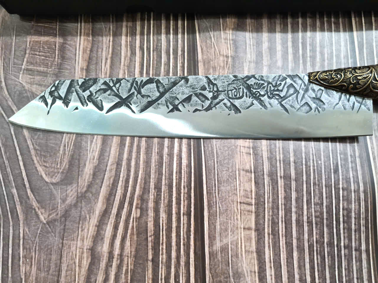 DAO BẾP SASHIMI MẶT HOA VĂN MÃ N4 THÔNG TIN SẢN PHẨM TỔNG DÀI : 45cm, LƯỠI: 30cm,RỘNG : 4cm, dày: 2.5mm, CHẤT liệu lưỡi: thép IFA cao cấp Chất liệu CÁN: gỗ Cẩm chỉ,