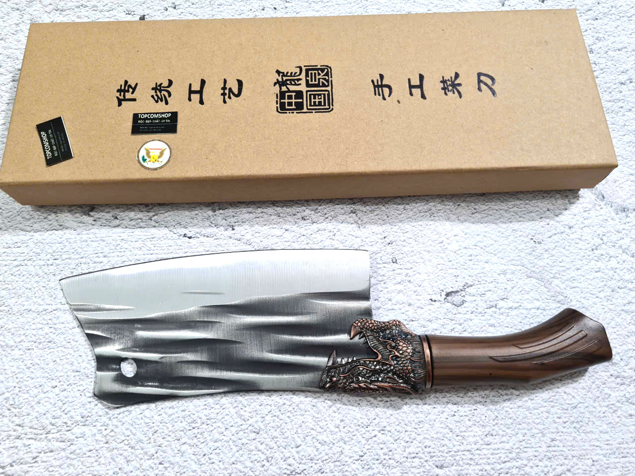 - Chức năng: Chặt xương ống, chân giò, trâu bò - Kích thước: Lưỡi: 22cm, cán: 10cm, rộng: 10cm, dầy: 5ly, trọng lượng: 800g - Cán : Gỗ mun, Khâu đồng đỏ , chốt đinh