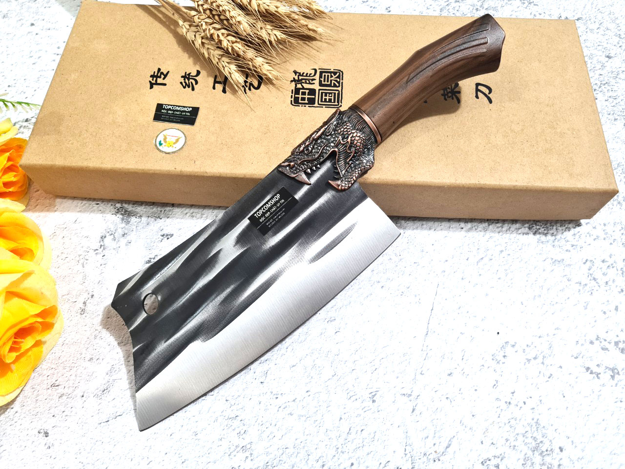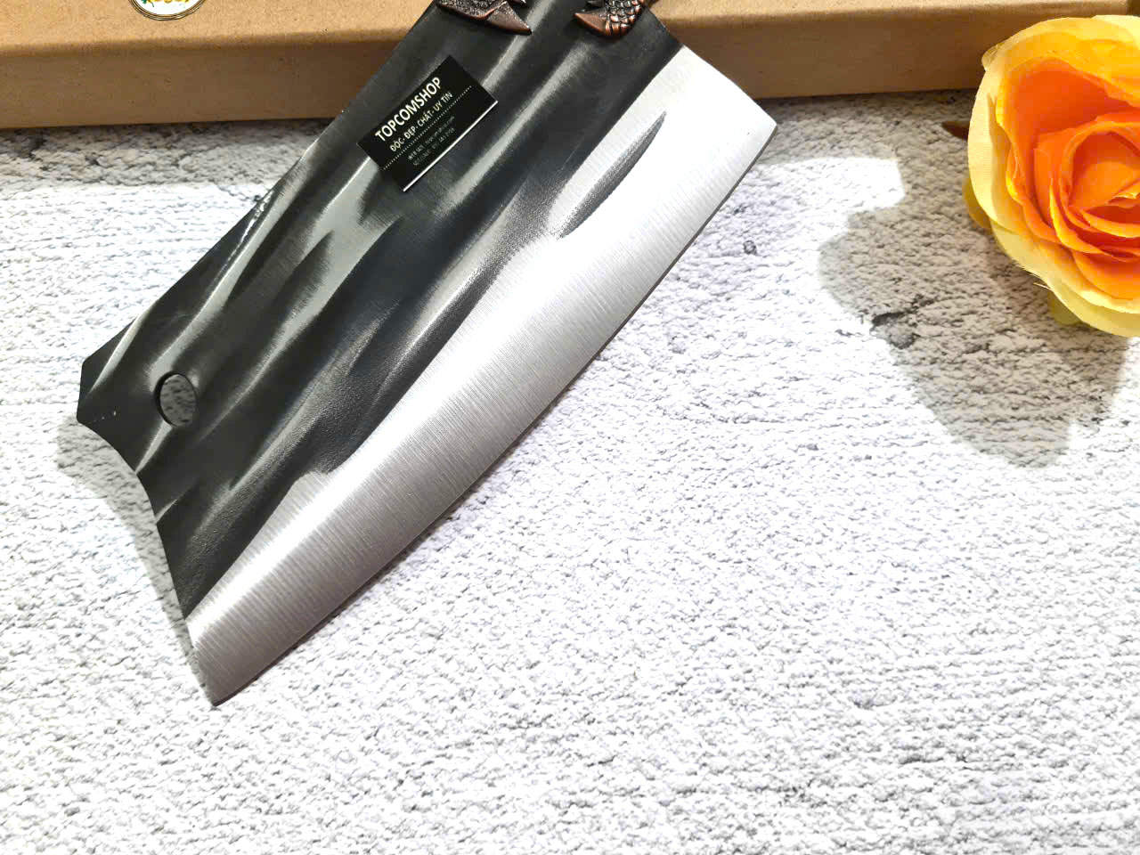 - Chức năng: Chặt xương ống, chân giò, trâu bò - Kích thước: Lưỡi: 22cm, cán: 10cm, rộng: 10cm, dầy: 5ly, trọng lượng: 800g - Cán : Gỗ mun, Khâu đồng đỏ , chốt đinh