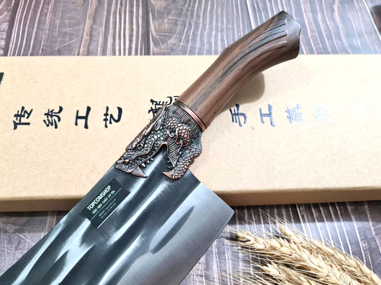 - Chức năng: Chặt xương ống, chân giò, trâu bò - Kích thước: Lưỡi: 22cm, cán: 10cm, rộng: 10cm, dầy: 5ly, trọng lượng: 800g - Cán : Gỗ mun, Khâu đồng đỏ , chốt đinh