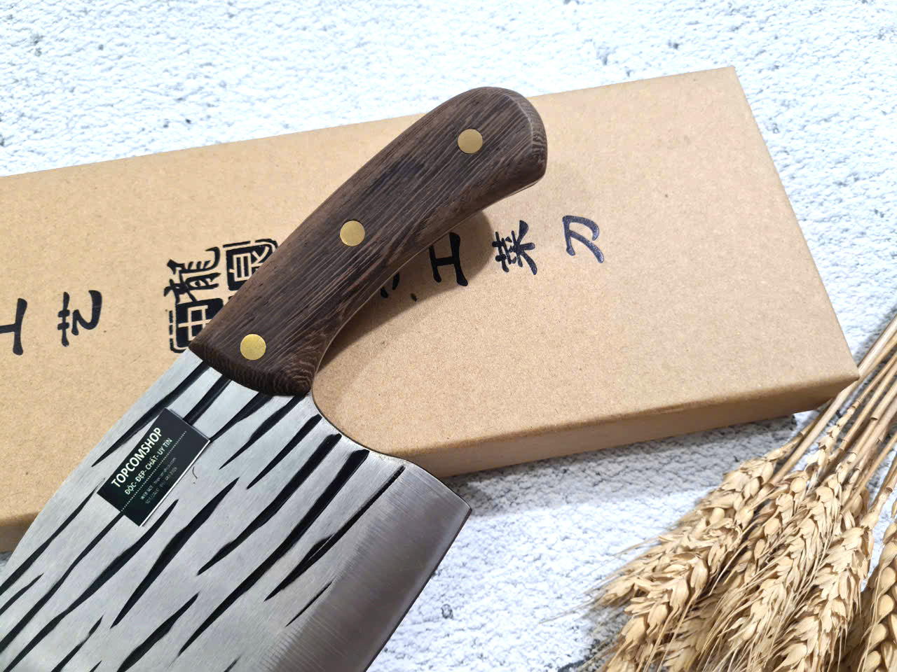 - Chức năng: chuyên chặt thái cá, chặt gà, lọ - Kích thước: Lưỡi: 26cm, cán: 12,5cm, rộng: 6,5cm, dầy: 4ly, trọng lượng: 480g - Cán : Gỗ mun , Khâu và chốt đồng đỏ
