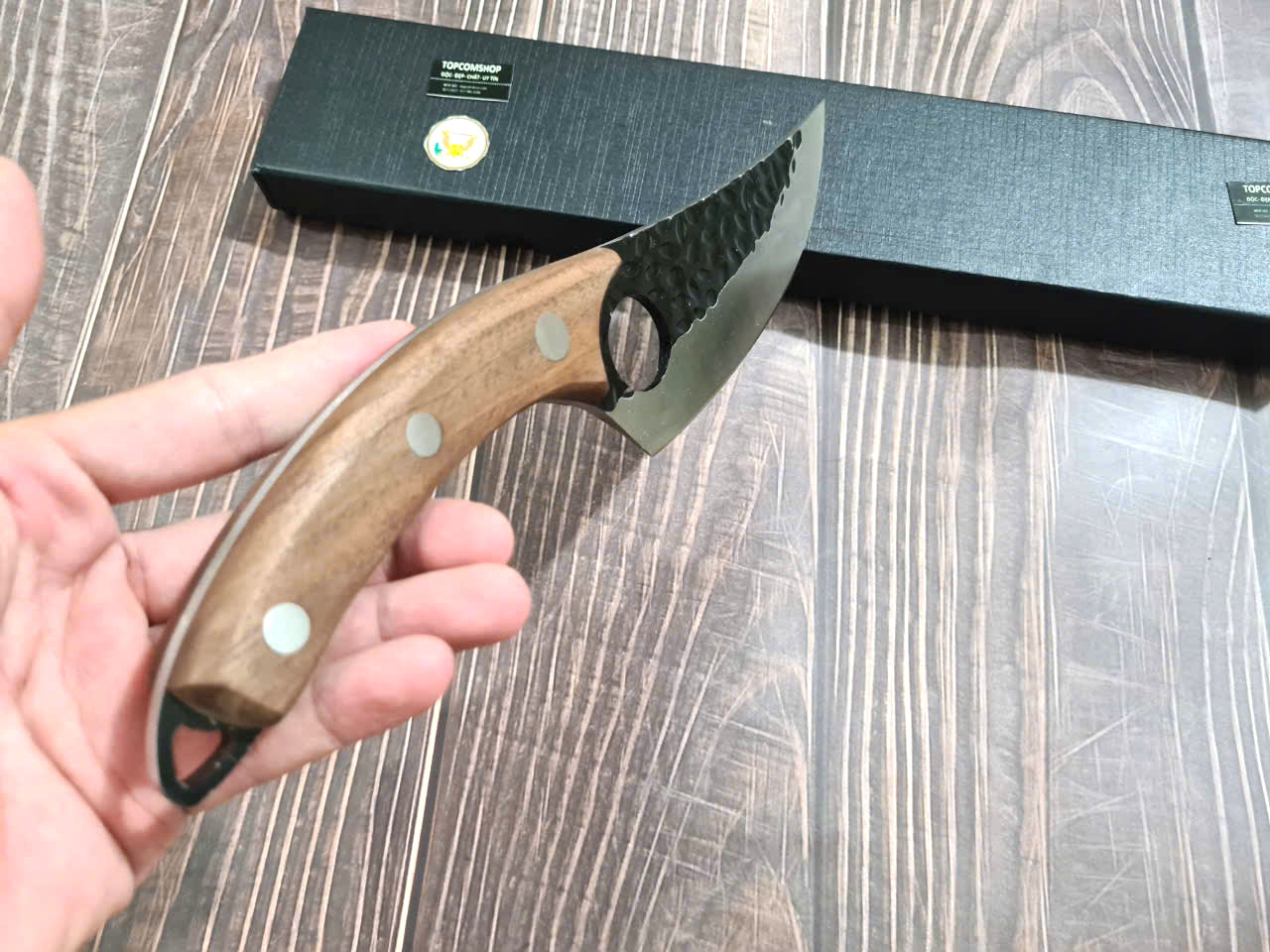 - Chất liệu: 100% thép nhíp ô tô được lựa chọn và kiểm duyệt kỹ càng. - Chất liệu cán: gỗ cẩm chỉ núi - Kích thước: lưỡi: 18cm, cán: 12cm, rộng: 6,5cm, dầy: 0,1,
