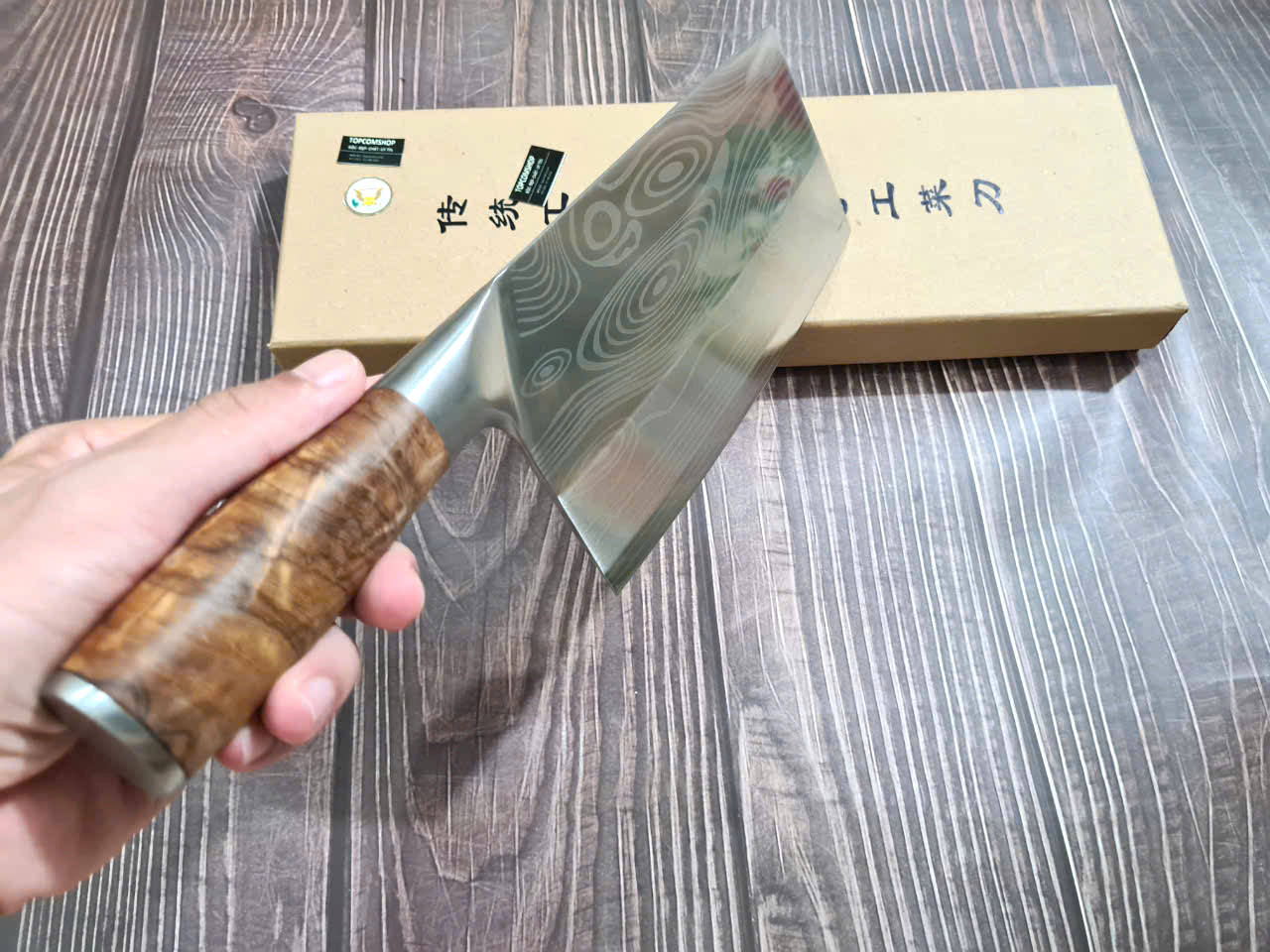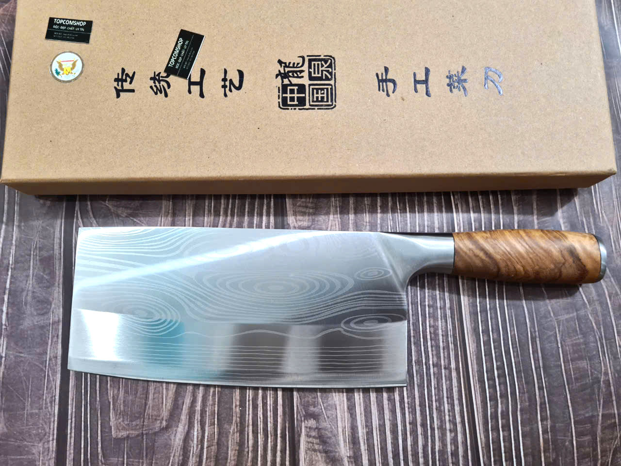 Dao Phúc Sen - Dao Chặt Gà Cán Ốp Nu Nghiến G05OCD - Kích thước: lưỡi: 23cm, cán: 13cm, rộng: 8,5cm-9cm, dầy: 0,3, trọng lượng: 500g - 600g - Chức năng: sử dụng chuyên chặt