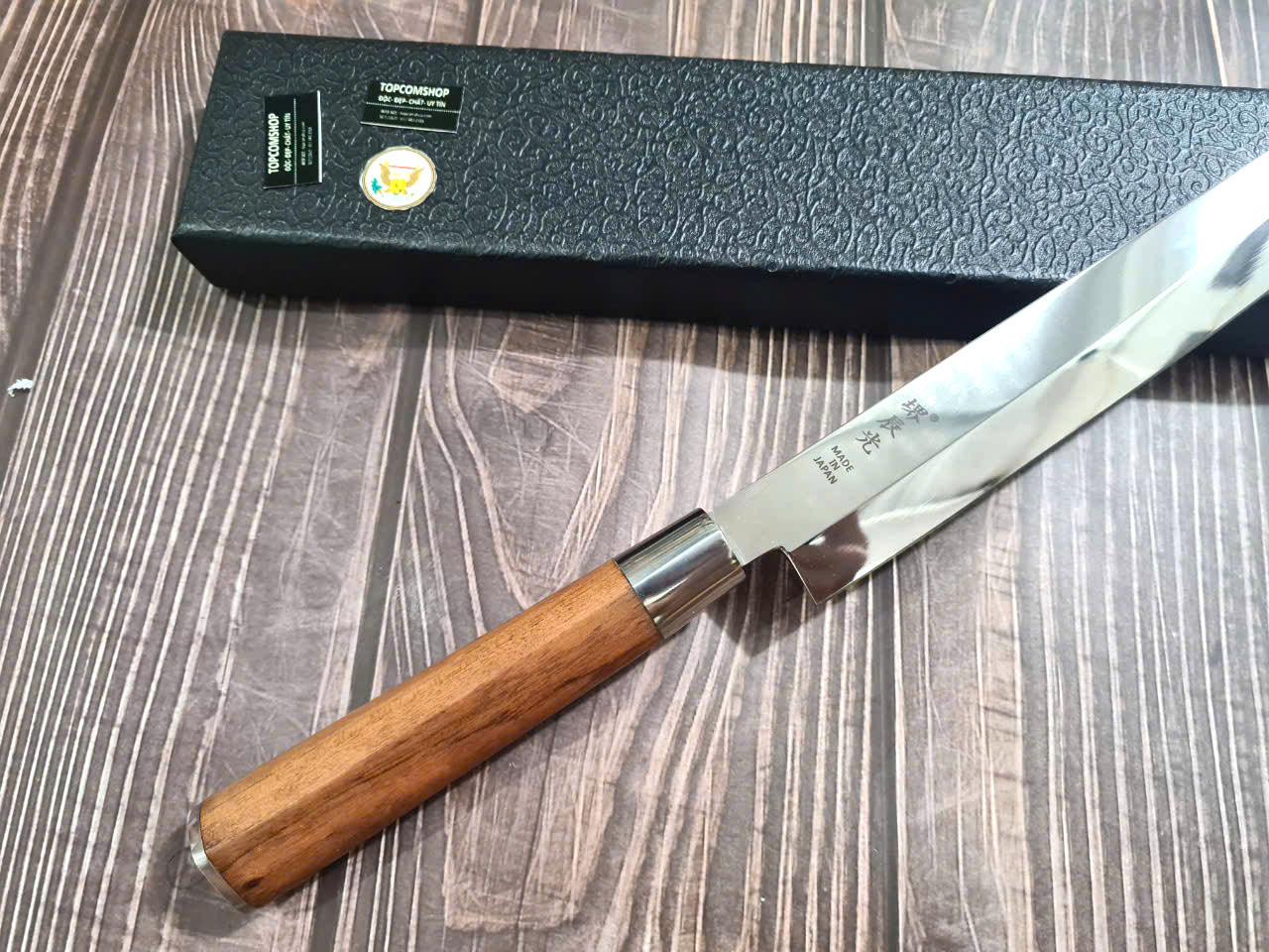Dao Phúc Sen bản Takohiki - Kích thước: lưỡi: 24cm, cán: 12cm, rộng: 3.5cm, dầy: 2.5 ly, trọng lượng: 200g - Chức năng: sử dụng chuyên thái thịt ,cá, rau củ và các thực phẩm