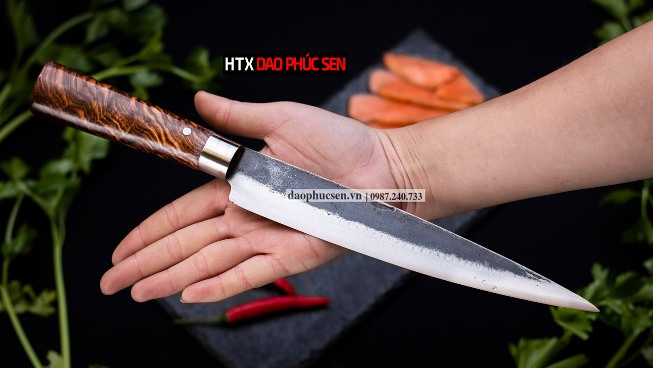 Dao Phúc Sen bản Takohiki - Kích thước: lưỡi: 24cm, cán: 12cm, rộng: 3.5cm, dầy: 2.5 ly, trọng lượng: 200g - Chức năng: sử dụng chuyên thái thịt ,cá, rau củ và các thực phẩm