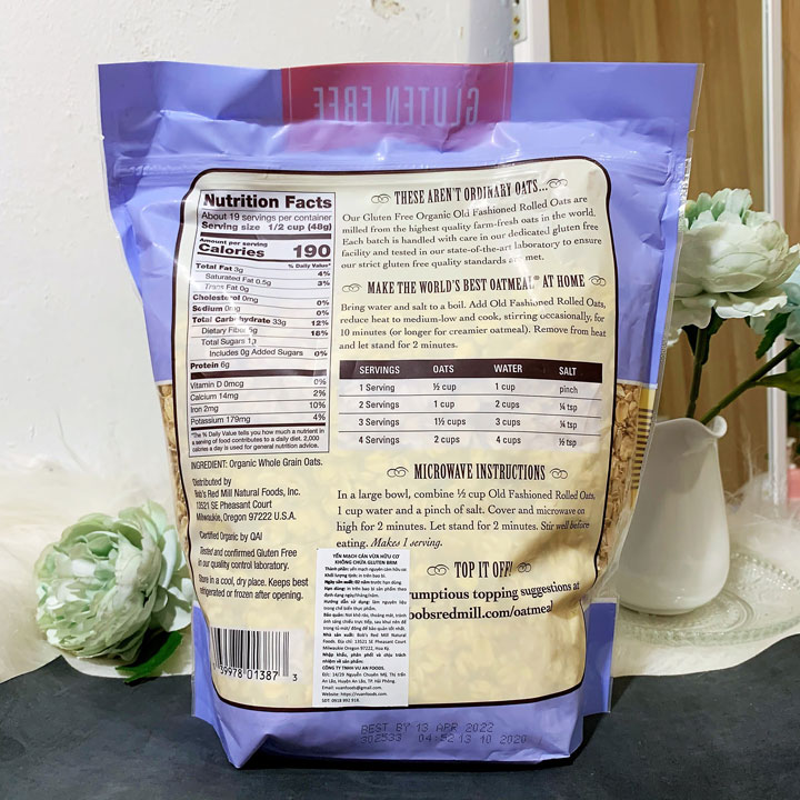 Yến mạch vốn là loại hạt không chứa gluten. Để được công nhận là sản phẩm Glute Free thực sự, Yến Mạch Cán Vừa Hữu Cơ của Bob's Red Mill phải được chế biến tại cơ sở sản xuất chuyên biệt để được công nhận Gluten Free.