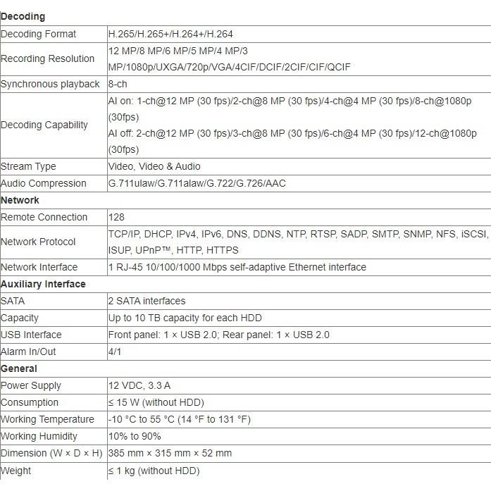 Thông số kỹ thuật đầu ghi hình IP 8 kênh AcuSense HIKVISION DS-7608NXI-K2 – Chuẩn nén H.265/H.265+/H.264/H.264+ – HDMI @1920 x 1080, VGA @1920 x 1080, 01 x RJ45 0/100/1000 Mbps, 02 x USB. –