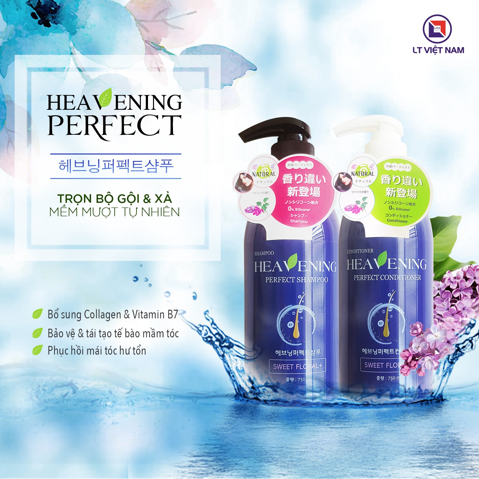 Cặp dầu gội xả dưỡng chất suôn mượt tóc Heavening Perfect (Set 01 Gội & 01 Xả x 750ml) Công dụng: Bổ sung thành phần Collagen & Vitamin B7, ngăn ngừa rụng tóc và kích thích