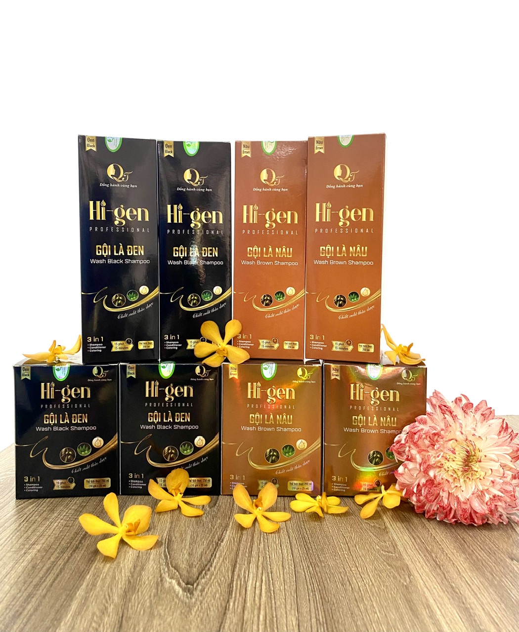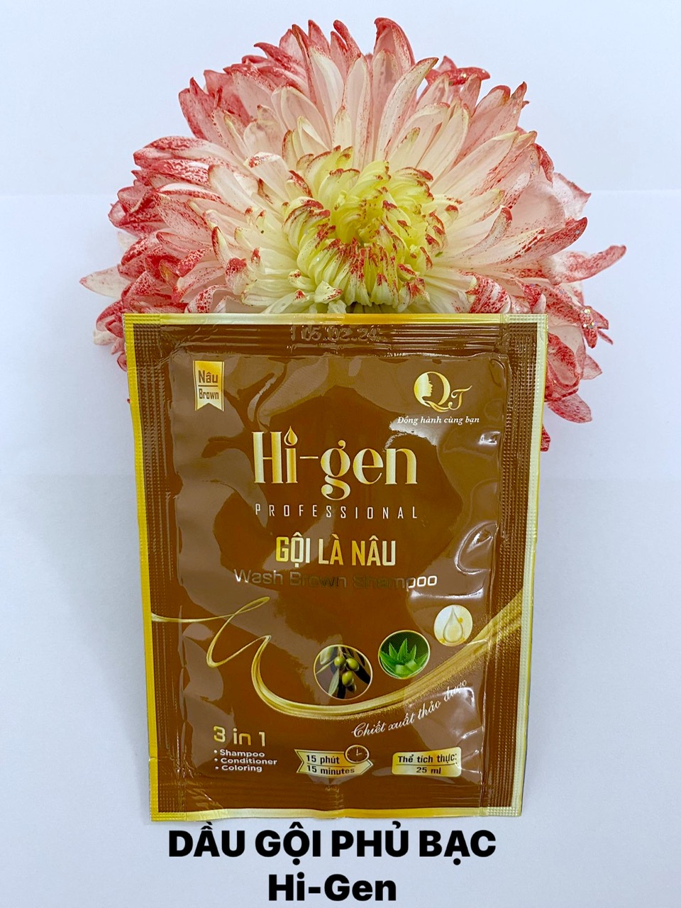 Dầu gội Phủ Bạc Hi-gen _ Gội là Nâu gói 25ml (Hộp 10 gói) Với nguyên liệu nhập khẩu trực tiếp từ nước ngoài mang mùi hương thoang thoảng từ hà thủ ô, linh chi, nhân sâm cùng nhiều loại thảo dược khác… sản phẩm hấp thu hắc sắc tố nhanh chóng và an toàn cho người sử dụng. Cách dùng: Bước 1:Làm ướt tóc, lau sơ lại (không lau quá khô, không thêm nước khi gội) Bước 2: Đeo găng tay vào ( dầu gội không gây hại nhưng tránh làm đen móng tay) Bước 3: Cắt gói dầu gội và cho toàn bộ hỗn hợp ra tay rồi trộn đều (Bao bì dầu gội có 2 ngăn). Sau đó, thoa đều hỗn hợp lên tóc và mát xa 15 - 25 phút. Trường hợp tóc đang sửa dụng thuốc nhuộm thì có thể để lâu hơn. Bước 4: Dùng khăn ướt lau sạch vùng da hoặc vành tai ( nếu bị dính dầu gội). Bước 5: Xả lại với nước sạch, không dùng dầu gội, dầu xả trong vòng 24h. Công dụng: Phủ bạc mái tóc nhanh chóng, màu tóc đen huyền tự nhiên. Thơm nhẹ mùi nhân sâm không gây hắc khó chịu Bền màu, trung bình 1-2 tháng mới cần gội lại. Không gây kích ứng cho da đầu Chỉ 25 phút với các bước vô cùng đơn giản có ngay mái tóc nâu hạt dẻ Hạn sử dụng: 3 năm kể từ ngày sản xuất Lưu ý: