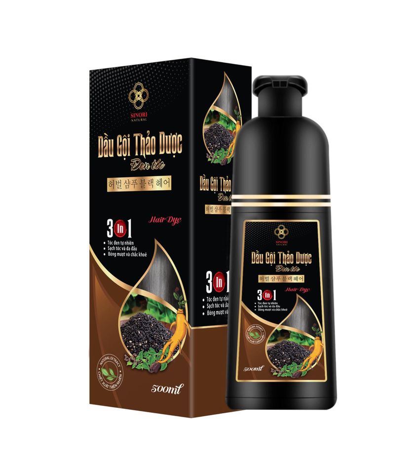 DẦU GỘI THẢO DƯỢC NHUỘM ĐEN TÓC SINORI CHAI 500 ML Thành phần: Tinh chất thảo dược thiên nhiên giúp bảo vệ mái tóa và da đầu như: nhân sâm, hà thủ ô, vừng đen,