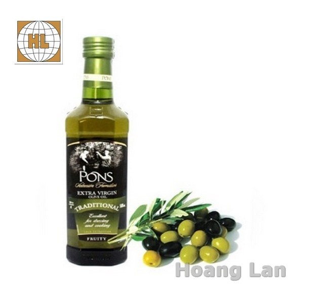 - Dầu Olive Extra Virgin PONS 500ml - Tây Ban Nha ( Chai Thủy Tinh ) - _Thời hạn sử dụng: 30 tháng kể từ ngày sản xuất - _NSX, HSD: Xem trên bao bì. - _Thể tích thực: 500 ml - _Xuất xứ: Euroaliment P.A.C., S.L.U (Tây Ban Nha) - - Đây là một loại chất béo được chiết xuất từ loại quả của cây Olive hay có tên quốc tế là Olea Europaea. Loại cây này là đặc sản mang tên tuổi của vùng đất Địa Trung Hải. Dầu Olive được sử dụng rộng rãi trong cuộc sống. Tuy nhiên được ưu tiên và chú trọng trong lĩnh vực mỹ phẩm, nấu ăn và dược liệu. - - _ Dầu Olive Extra Virgin PONS 250ml - Tây Ban Nha được sản xuất theo phương pháp ép lạnh, không đòi hỏi sử dụng hóa chất hay tác động nhiệt vào quy trình, giúp dầu giữ lại được các chất dinh dưỡng và có độ tinh khiết cao nhất. Vì vậy mà dầu Olive ép lạnh được nghiên cứu là mang lại nhiều lợi ích về sức khỏe hơn dầu Olive thông thường. - - _ Phần lớn chất béo chứa trong dầu Olive Pons Extra Virgin đều là chất béo không bão hòa rất tốt cho sức khỏe. Tiêu thụ chất béo không bão hòa giúp giảm khả năng mắc các bệnh tiểu đường loại 2, tim, ung thư và bệnh mãn tính. Dầu Olive ép lạnh cũng chứa ít nhất 30 hợp chất thực vật có lợi, nhiều chất chống oxy hóa mạnh có tác dụng chống viêm, hạ huyết áp, ngăn chặn sự phát triển của một số loại ung thư. Dầu Olive hoàn toàn có thể thay thế dầu ăn thông thường và là thực phẩm bổ sung lành mạnh. - - _Dầu có hàm lượng acid không quá 0.5o - - _Hương vị thơm ngon đậm đà hơn nhờ quả ô-liu được ép tươi ngay sau khi thu hoạch - - _Thành phần: Dầu Olive nguyên chất 100% được sản xuất theo phương pháp ép lạnh quả tươi ngay sau khi thu hoạch. -