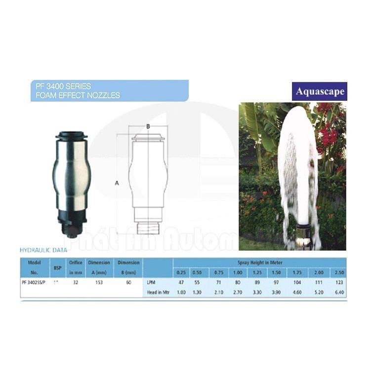 Đầu phun nước nghệ thuật tạo hình cột nước sủi bọt. Cột nước phun lên có bọt khí, tạo cảnh quan và tạo hình tươi mới, hiện đại. Có thể sử dụng kèm đèn âm