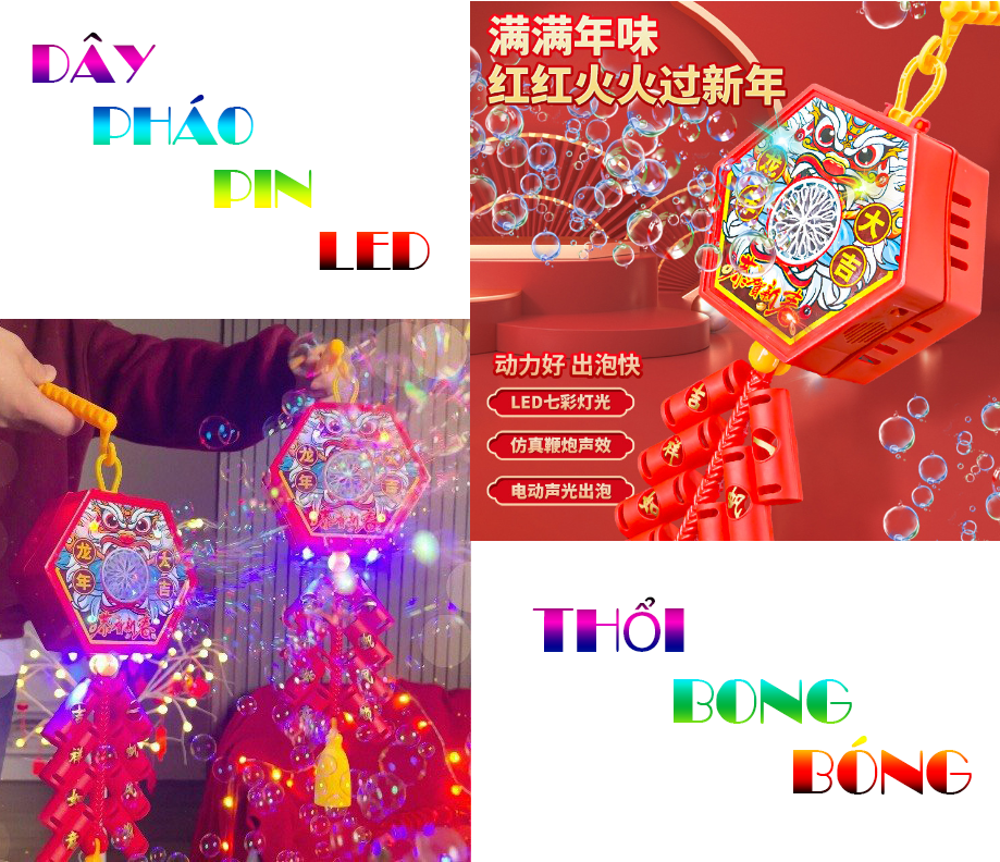 Đồ chơi ngày Tết - Dây Pha/o Thổi Bong Bóng Có Đèn Led Vui Nhộn Dùng PinTrang trí theo chủ đề Tết với gam màu đỏ vàng sặc sỡ là biểu tượng cho sự thịnh vượng, may mắn, sung túc giàu sang cho gia chủ...