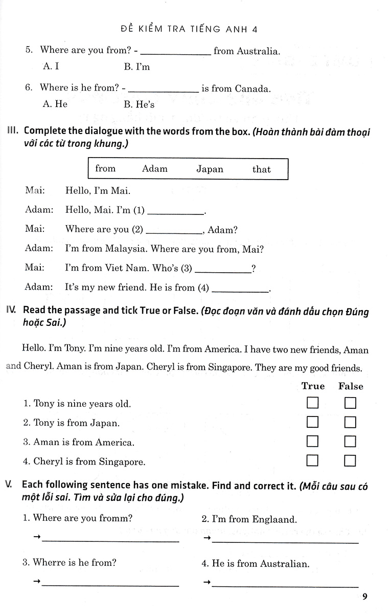 Cuốn sách “Đề kiểm tra Tiếng Anh 4” là một tài liệu cần thiết cho các em trong việc ôn tập và củng cố kiến thức để chuẩn bị cho các bài kiểm tra đánh giá thường xuyên và các bài kiểm tra, cuối kì môn Tiếng Anh lớp 4.