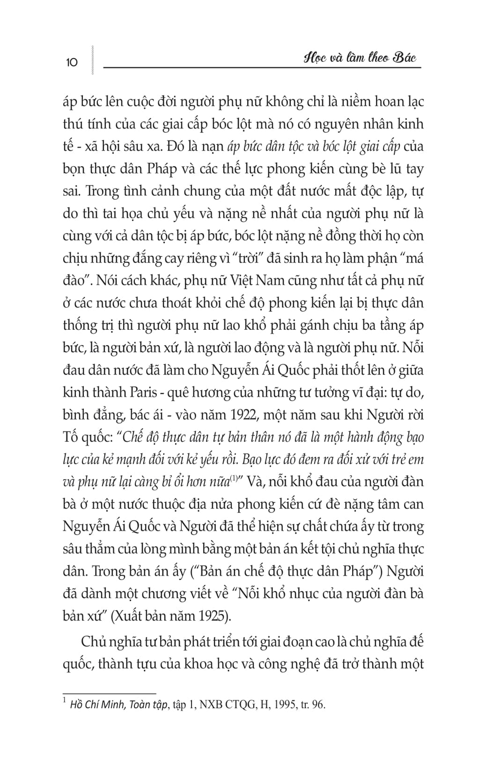 Mua tại TiktokBộ sách “Học và làm theo Bác” gồm 5 quyển, giúp bạn đọc tìm hiểu, nghiên cứu học tập tư tưởng, đạo đức và tác phong Hồ Chí Minh. Đem sức ta mà giải phóng cho ta giúp chúng ta cảm nhận được những tư tưởng, tình cảm của Người đối với phụ nữ - Phụ nữ là một lực lượng hết sức quan trọng góp phần tạo nên động lực mạnh mẽ của toàn xã hội và là mục tiêu của sự nghiệp công nghiệp hóa, hiện đại hóa đất nước. Qua đó góp tiếng nói vào việc tìm hiểu lòng nhân ái, bao la của Bác – một trái tim yêu thương “mọi kiếp người”.