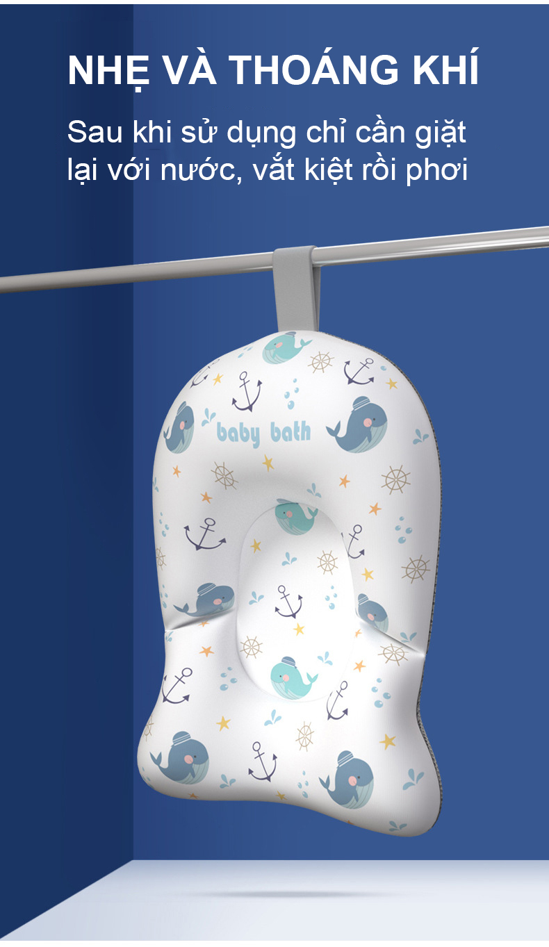 - Chất liệu mềm mại, an toàn - Nâng đỡ hiệu quả cơ thể và thiết kế phù hợp với lưng của bé - Móc hình chữ U giúp cố định vào thau tắm bé