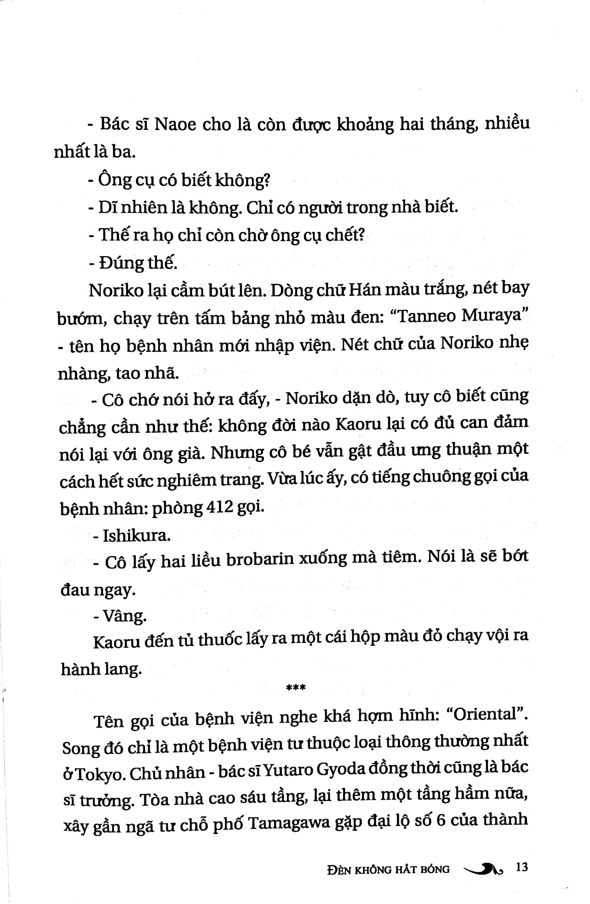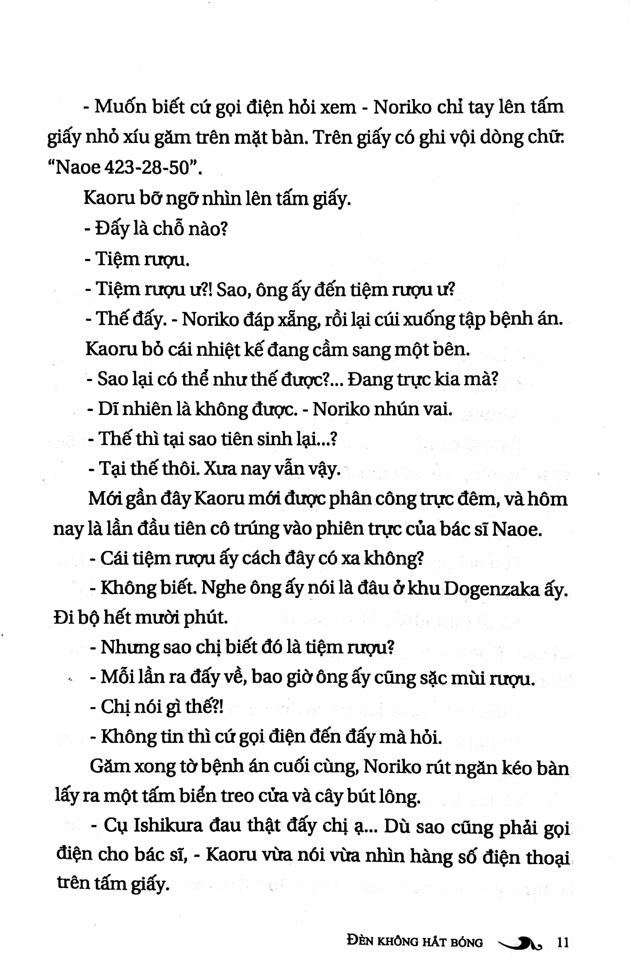 Đèn Không Hắt Bóng không đơn thuần kể về đời sống bệnh viện. Nhìn ở góc độ khác, nó là câu chuyện tình yêu lạnh lùng, bí ẩn và đau đớn. Mối quan hệ giữa Noriko và bác sĩ Naoê phải chăng là tình yêu một chiều? Đứng bên cạnh vị bác sĩ tài hoa, hình ảnh của Noriko khá lặng lẽ. Yêu Naoê, tự nguyện gắn bó với anh, cô vẫn phải chứng kiến hàng loạt mối quan hệ bất thường của Naoê với những phụ nữ khác, từ vợ và con gái của bác sĩ viện trưởng, cô gái quán bar, cho đến nàng ca sĩ ngôi sao… Nhưng đau khổ hơn hết, cô nhận ra Naoê là một pháo đài riêng, không cho cô thâm nhập, ngay cả những giây phút gần gũi nhất cả về thân xác lẫn tình cảm.