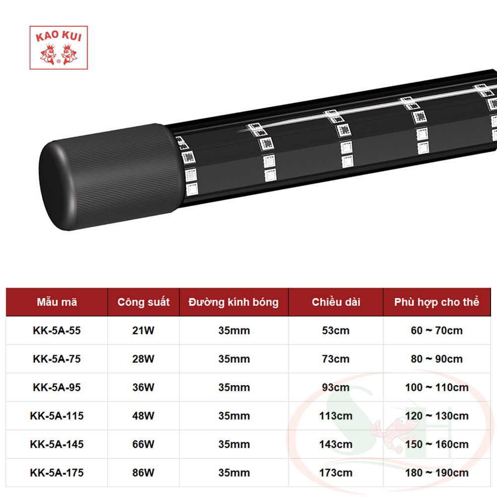 Đèn led KaoKui 5A với thiết kế chống nước và tản nhiệt tối ưu, có thể sử dụng trên cạn hoặc chìm trong bể. Mắt led UVA và UVB giúp diệt khuẩn, ức chế tảo hại, giảm nguy cơ nấm bệnh cho cá và tạo môi trường nước trong sạch mà không ảnh hưởng đến động thực vật trong bể.