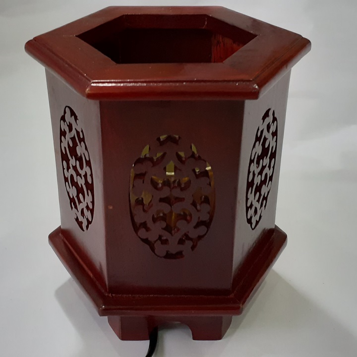 Đèn xông tinh dầu gỗ hương DLG01 Tỏa hương thơm trang trí nội thất nhà cửa Đèn xông tinh dầu gỗ, gỗ hương tự nhiên Kích thước: hình lục giác, Bề rộng đèn 13cm x16