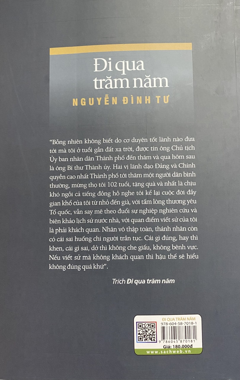 “Bỗng nhiên không biết do cơ duyên tốt lành nào đưa tới mà tôi ở tuổi gần đất xa trời, được tin ông Chủ tịch Ủy ban nhân dân Thành phố đến thăm và qua hôm sau là ông Bí thư Thành ủy. Hai vị lãnh đạo Đảng và Chính quyền cao nhất Thành phố tới thăm một người dân bình thường, mừng thọ tôi 102 tuổi, tặng quà và nhất là chịu khó ngồi cả tiếng đồng hồ nghe tôi kể lại cuộc đời đầy gian khổ của tôi từ nhỏ đến già, với tấm lòng thương yêu Tổ quốc, vẫn say mê theo đuổi sự nghiệp nghiên cứu và biên khảo lịch sử nước nhà, với quan điểm viết sử của tôi là phải khách quan. Nhân vô thập toàn, thánh nhân còn có cái sai huống chi người trần tục. Cái gì đúng, hay thì khen, cái gì sai, dở thì không che giấu, không bênh vực. Nếu viết sử mà không khách quan thì hậu thế sẽ hiểu không đúng quá khứ”. Trích Đi qua trăm năm