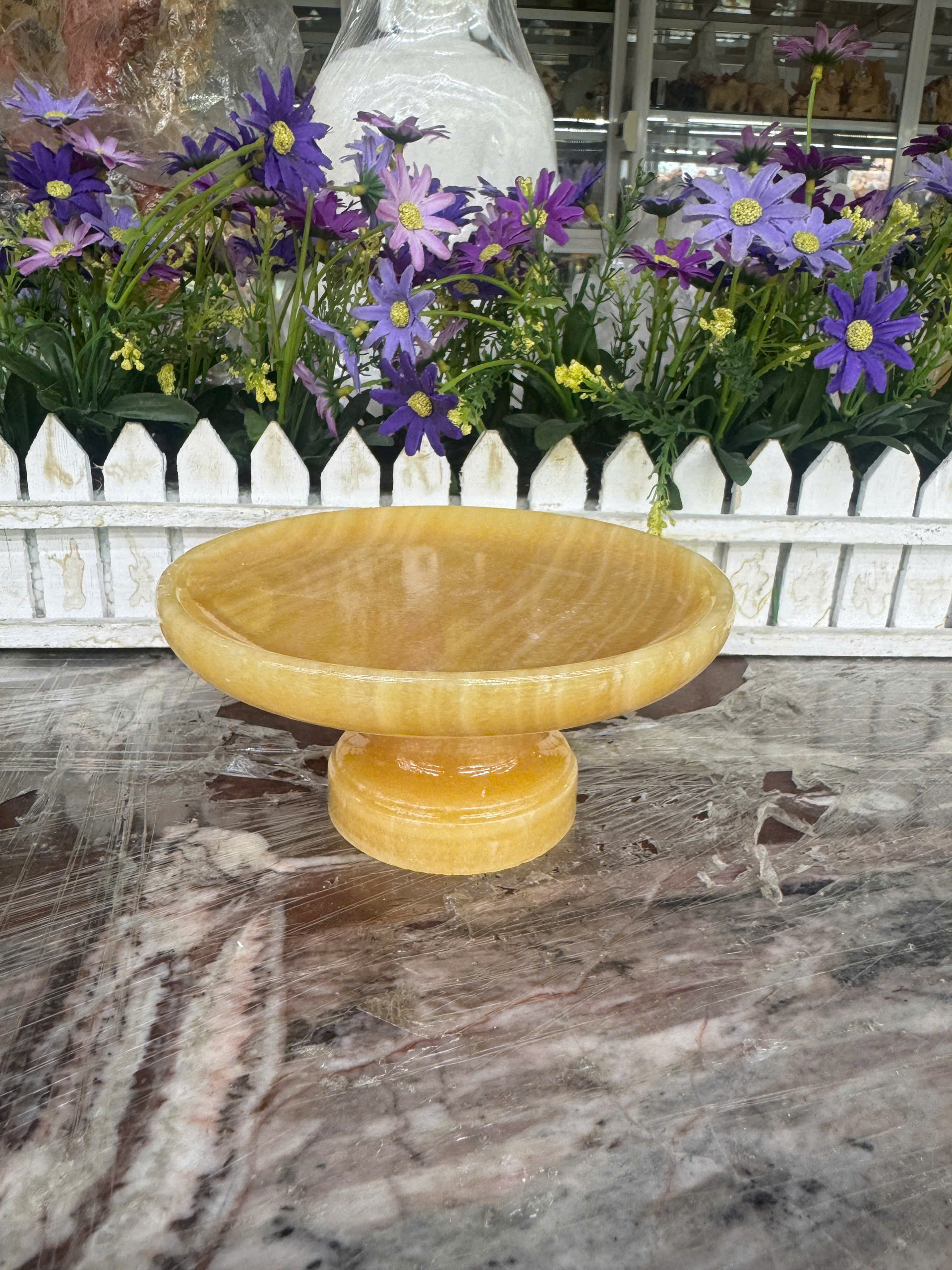 Chất liệu: Đá ngọc hoàng long và đá ngọc onyx Kích thước: Cao 7cm; Đường kính 15cm Khối lượng: Khoảng 1kg Dĩa đựng trái cây trang trí bàn thờ ông địa, bàn thờ gia tiên....