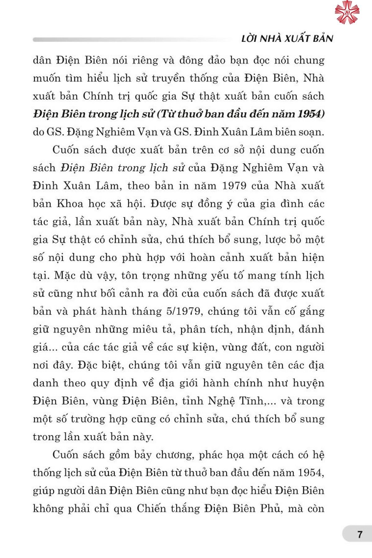 Mua tại TiktokĐiện Biên Phủ Trong Lịch Sử - Thuở Ban Đầu Đến Năm 1964 Sách gồm bảy chương, phác họa một cách có hệ thống lịch sử của Điện Biên từ thuở ban đầu đến năm 1954, giúp người dân Điện Biên cũng như bạn đọc cả nước hiểu Điện Biên không phải chỉ qua Chiến thắng Điện Biên Phủ, mà còn đưa tầm mắt vượt qua nhiều thế kỷ của quá khứ để tin tưởng vững chắc thêm vào hướng đi của tương lai đất nước cũng như của tỉnh Điện Biên.