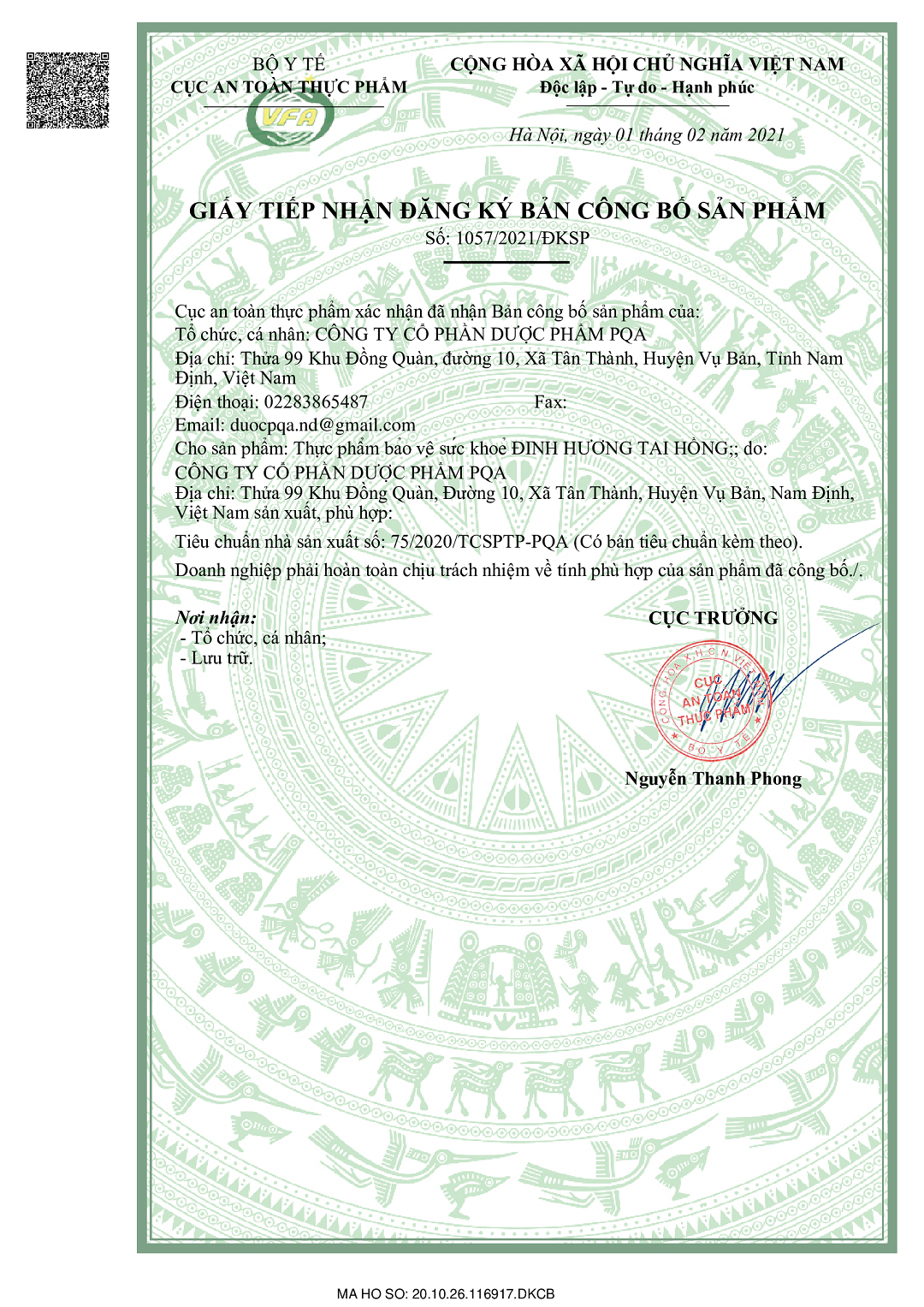 - Địa chỉ sản xuất: Công ty Cổ phần Dược phẩm PQA. Thửa 99, Khu Đồng Quàn, Xã Tân Thành, Huyện Vụ Bản, Tỉnh Nam Định.
