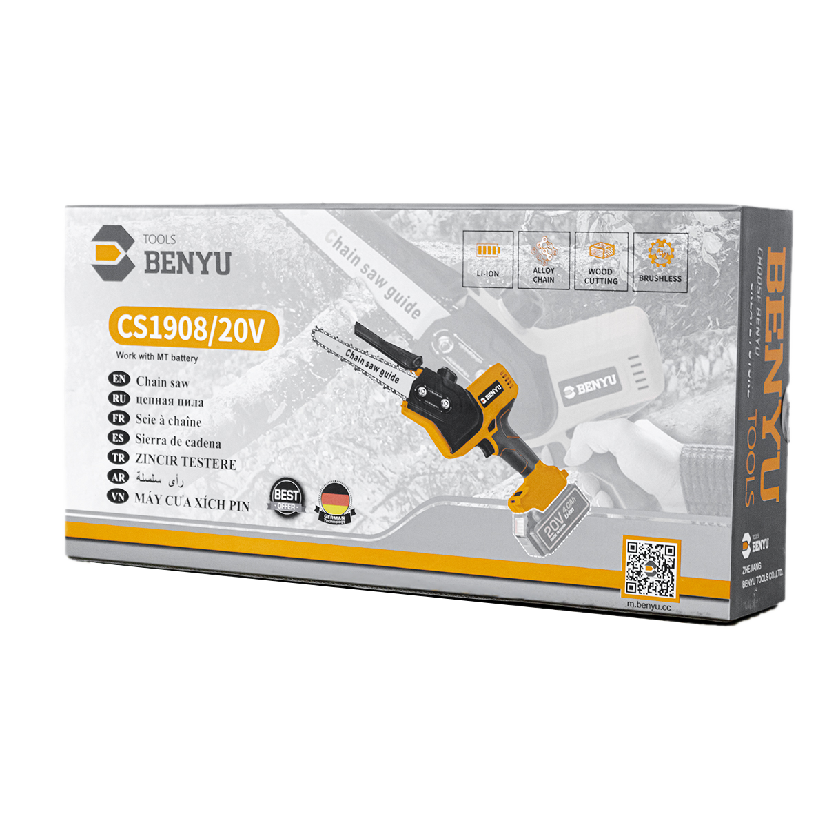 BENYU CS1908 là chiếc máy cưa xích có thiết kế nhỏ gọn. Máy sử dụng pin nên có tính linh động cao, dễ dàng mang theo các công trình, sử dụng không phụ thuộc vào nguồn điện.