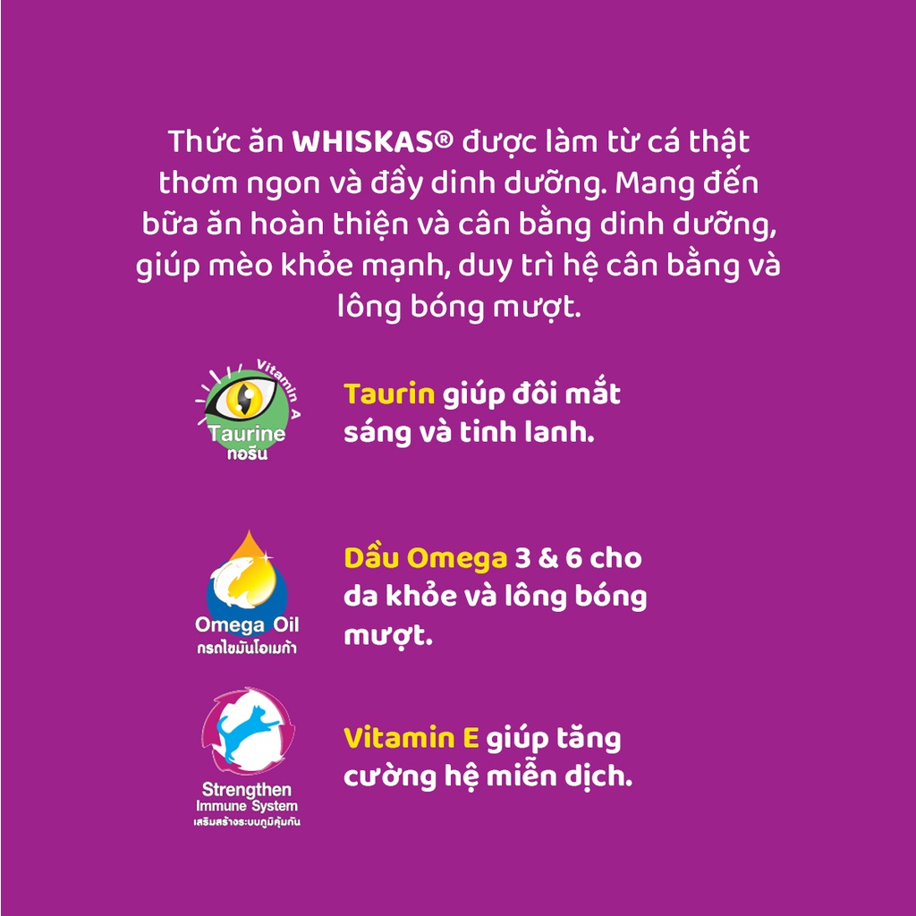 Đồ Ăn cho mèo lớn vị cá ngừ Whiskas túi 480g được lựa chọn từ những thành phần thịt, cá tươi để chế biến, sảm phẩm giàu protein, các vitamin và khoáng chất thiết yếu và không có chất bảo quản, mang đến tác dụng cân bằng dinh dưỡng hàng ngày cho thú cưng của bạn.
