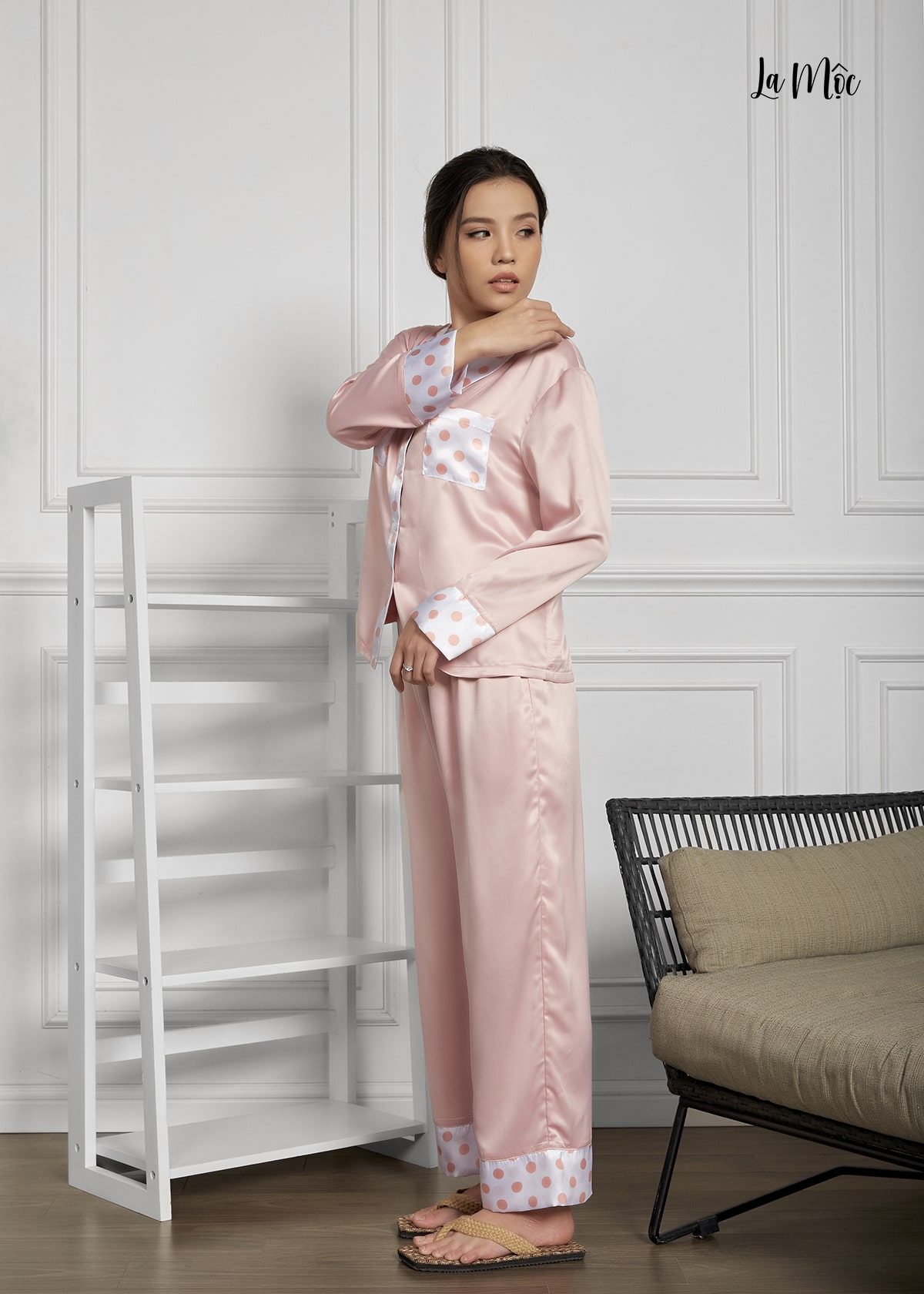 Bộ mặc nhà màu trắng họa tiết chấm bi, tay dài, quần dài, tạo sự kín đáo, vẫn giữ được nét đẹp nhẹ nhàng cho người mặc - LA MỘC chất liệu vải SATIN LỤA.