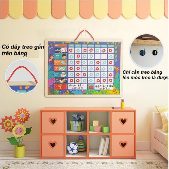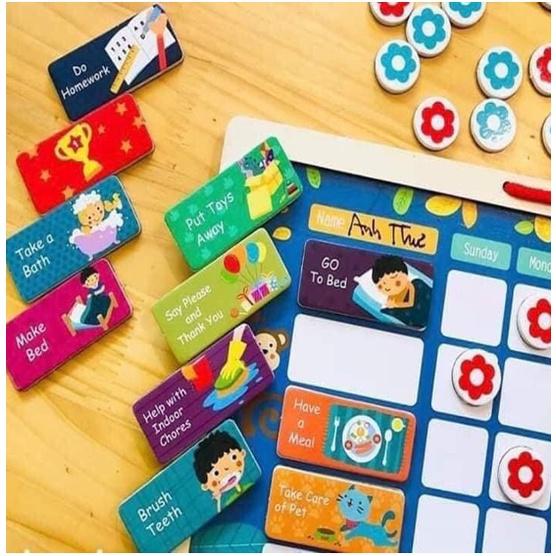 - 1 bộ gồm: 1 bảng có dây treo, 1 bút viết bảng, sticker và thẻ dán hoạt động thường ngày. Đặc điểm bộ Đồ chơi bảng khen thưởng thành tích bằng gỗ có nam châm cho bé - bảng khen thưởng kỷ luật các ngày trong tuần cho bé : ️Có thể treo trên tường ️Chất liệu bằng gỗ, trên bề mặt được gắn nam châm hút khá chắc chắn ️Kích thước bảng lại gọn : 40*30cm ️Các cột dọc là các ngày trong tuần, 21 bông hoa gỗ màu đỏ và 21 bông hoa màu xanh có gắn nam châm và 1 chiếc bút dạ loại xóa được để bố mẹ có thể ghi chú lại. CÁCH SỬ DỤNG Đồ chơi bảng khen thưởng thành tích bằng gỗ có nam châm cho bé - bảng khen thưởng kỷ luật các ngày trong tuần cho bé : Trước khi bắt đầu, 2 mẹ con hãy cùng thảo luận với nhau về những việc con cần thực hiện và tất nhiên là cả phần thưởng cho nỗ lực của con.