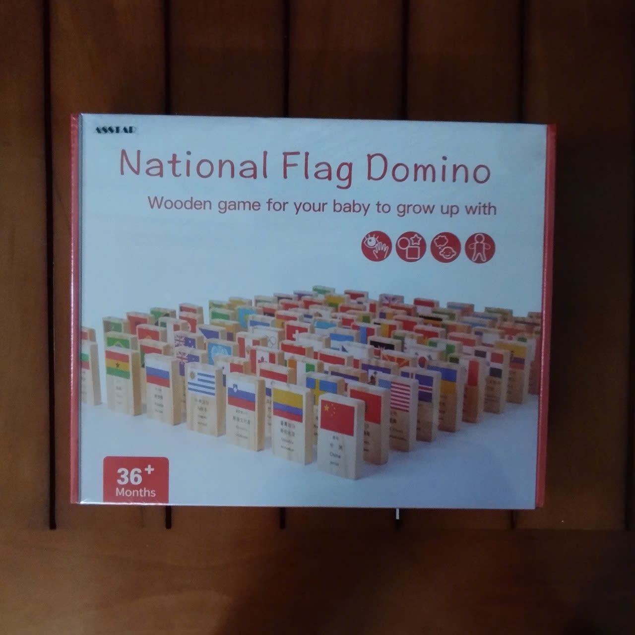 - Sản phẩm đồ chơi cho bé bằng gỗ bao gồm 100 quân Domino với 99 lá cờ là tên của 99 quốc gia trên thế giới và 1 lá cờ Liên Hợp Quốc.