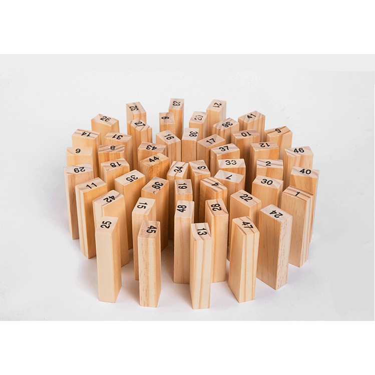 Bộ sản phẩm gồm 48 thanh gỗ và 1 hột xí ngầu có rất nhiều màu sắc rực rỡ với chất liệu làm từ 100% bằng gỗ gia công mịn màng, đảm bảo an toàn tuyệt đối cho sức khỏe người sử dụng.