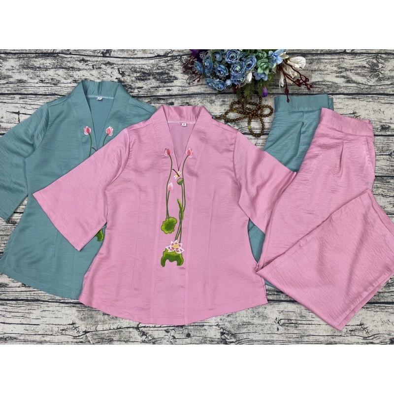 Mẫu pháp phục nữ - quần áo Phật tử đi chùa, đồ lam chất kate lụa mềm có co giãn Sen Hồng 0898553583