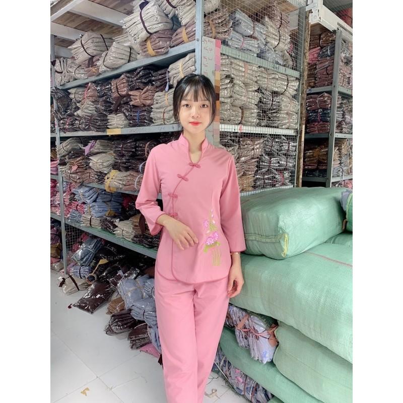Mẫu pháp phục nữ - quần áo Phật tử đi chùa, đồ lam chất kate lụa mềm có co giãn Sen Hồng 0898553583