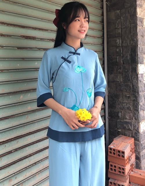 ✨Đồ Lam Đi Chùa # Sẫm 2Nút Hoa Thêu Phối Vải Đũi
