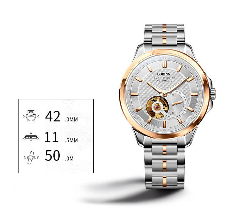 NGUỒN GỐC VÀ THÔNG SỐ SẢN PHẨM Thương Hiệu LOBINNI Mã sản phẩm L13022-1 Giới tính Nam Loại sản phẩm Đồng hồ Automatic Đường kính mặt 41 mm Chiều dày 11,5 mm Chất liệu vỏ