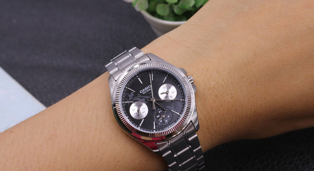 Đặc điểm kỹ thuật Chốt gập ba Dây đeo bằng thép không gỉ Mặt kính khoáng Chống nước Giờ hiện hành thông thường Đồng hồ kim: 3 kim (giờ, phút, giây), 3 mặt số (24