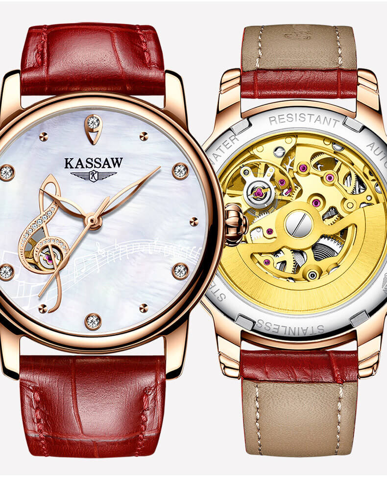 THÔNG SỐ SẢN PHẨM: Thương hiệu :Kassaw Mã sản phẩm : K990-2 Giới tính : Nữ Kiểu máy : Đồng hồ cơ (Automatic) Đường kính mặt : 33 mm Độ dày : 10 mm Chất liệu