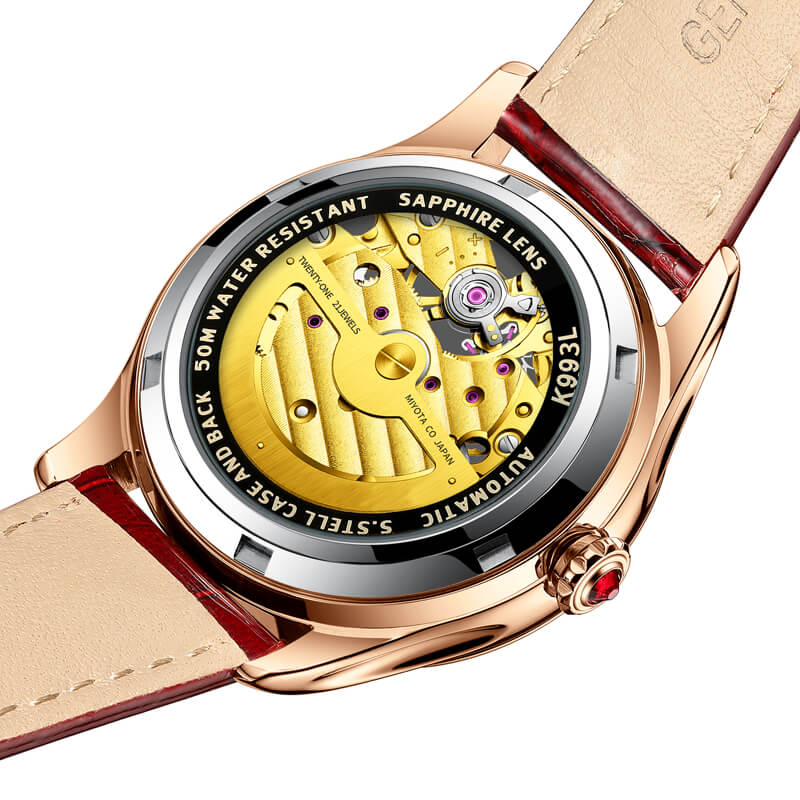 THÔNG SỐ SẢN PHẨM: Mã sản phẩm : K991-1 Giới tính : Nữ Kiểu máy : Automatic (Máy Cơ) Đường kính mặt : 35 mm Độ dày: 9 mm Chất liệu vỏ : Thép không