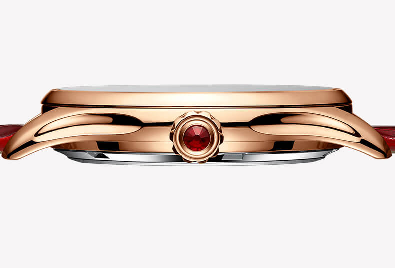 +Thiết kế hở tim phá cách kết hợp khéo léo với hoạ tiết hoa 4 cánh, viền mạ vàng PVD, cùng dây da màu đỏ thanh lịch sẽ khiến bạn nhận được sự "nể phục" vì gu chọn đồng hồ, cách chơi đồng hồ của mình !