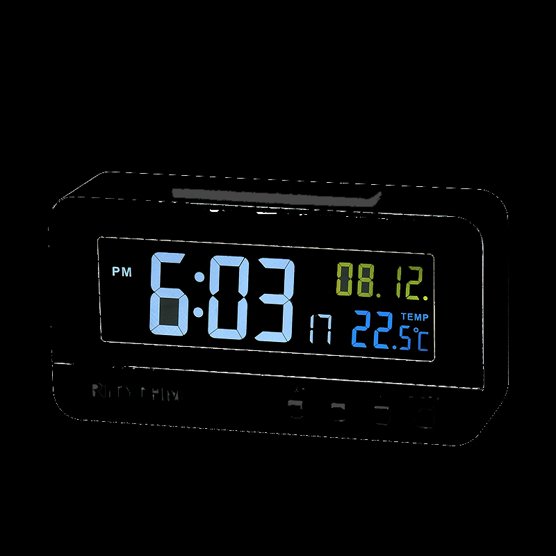 Đồng hồ để bàn báo thức Rhythm LCT097NR03 – KT 15.0 x 8.8 x 5.0cm, trọng lượng 190g. Vỏ nhựa. Dùng Pin. Màn hình tinh thể lỏng LCD có thể chỉnh độ đậm nhạt chữ.