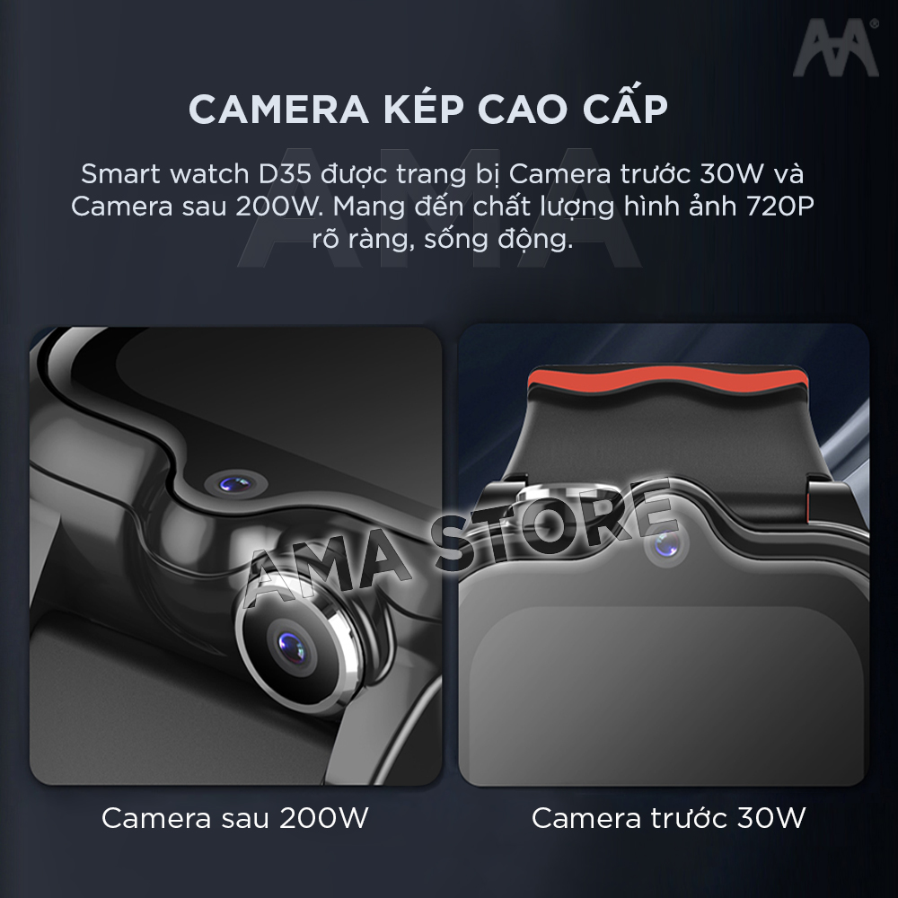 - Đồng hồ AMA Watch D35 có mặt tại Việt Nam cuối năm 2022 với rất nhiều chức năng tiện tích thiết yếu cho Lứa tuổi học sinh. Ngoài các tính năng chính như khả năng chống nước, thực hiện cuộc gọi Video HD, Định vị chính xác và Ổn định với sai số định vị chỉ 5 - 10m. D35 còn được trang bị 2 Camera chất lượng cao (Camera trước 30W, Camera sau 200W) giúp trẻ thoải mái thực hiện đam mê nhiếp ảnh.