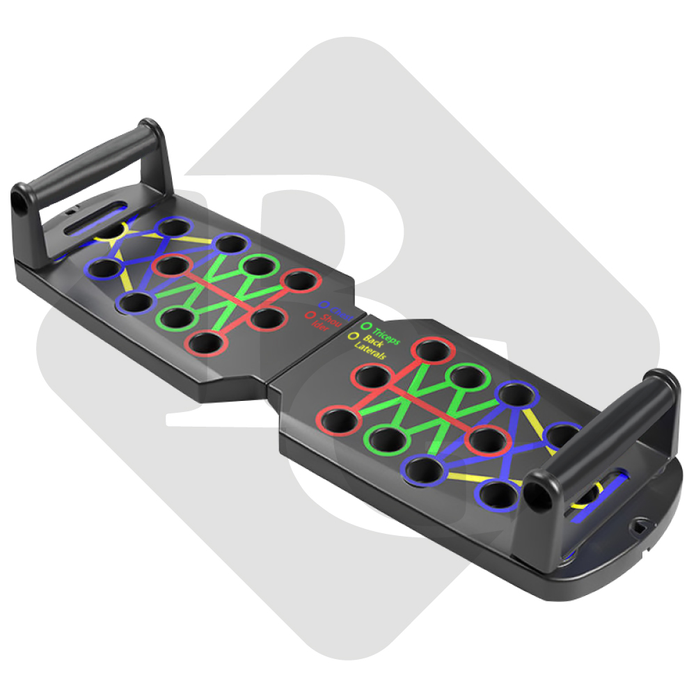 - Dụng cụ chống đẩy mã hóa màu khác nhau nhắm mục đích luyện tập thể dục cơ bắp cụ thể (đỏ cho vai, vàng cho lưng, xanh cho cơ tam đầu).
