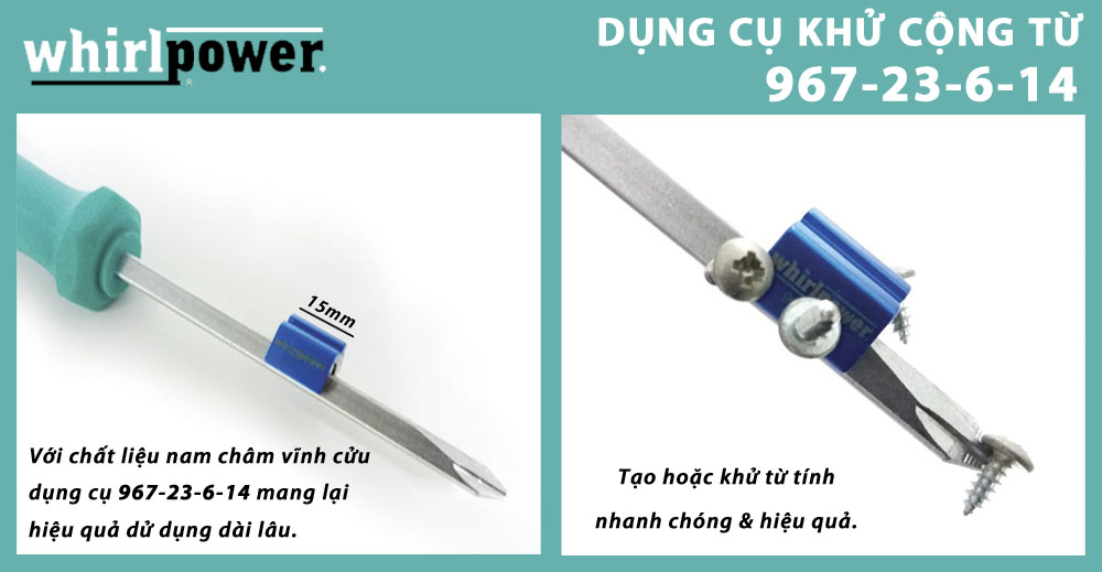 - Dụng cụ khử cộng từ Whirlpower 967-23-6-14 được thiết kế nhỏ gọn dễ sử dụng giúp tạo ra từ tính hay làm mất từ tính, được sử dụng nhiều nhất cho tô vít.